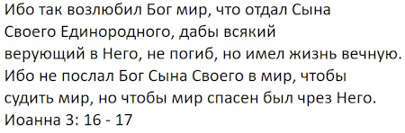 "Want God heeft zoveel liefde voor de wereld, dat Hij Zijn enige Zoon heeft gegeven; zodat ieder die in Hem gelooft, niet verloren gaat maar eeuwig leven heeft.